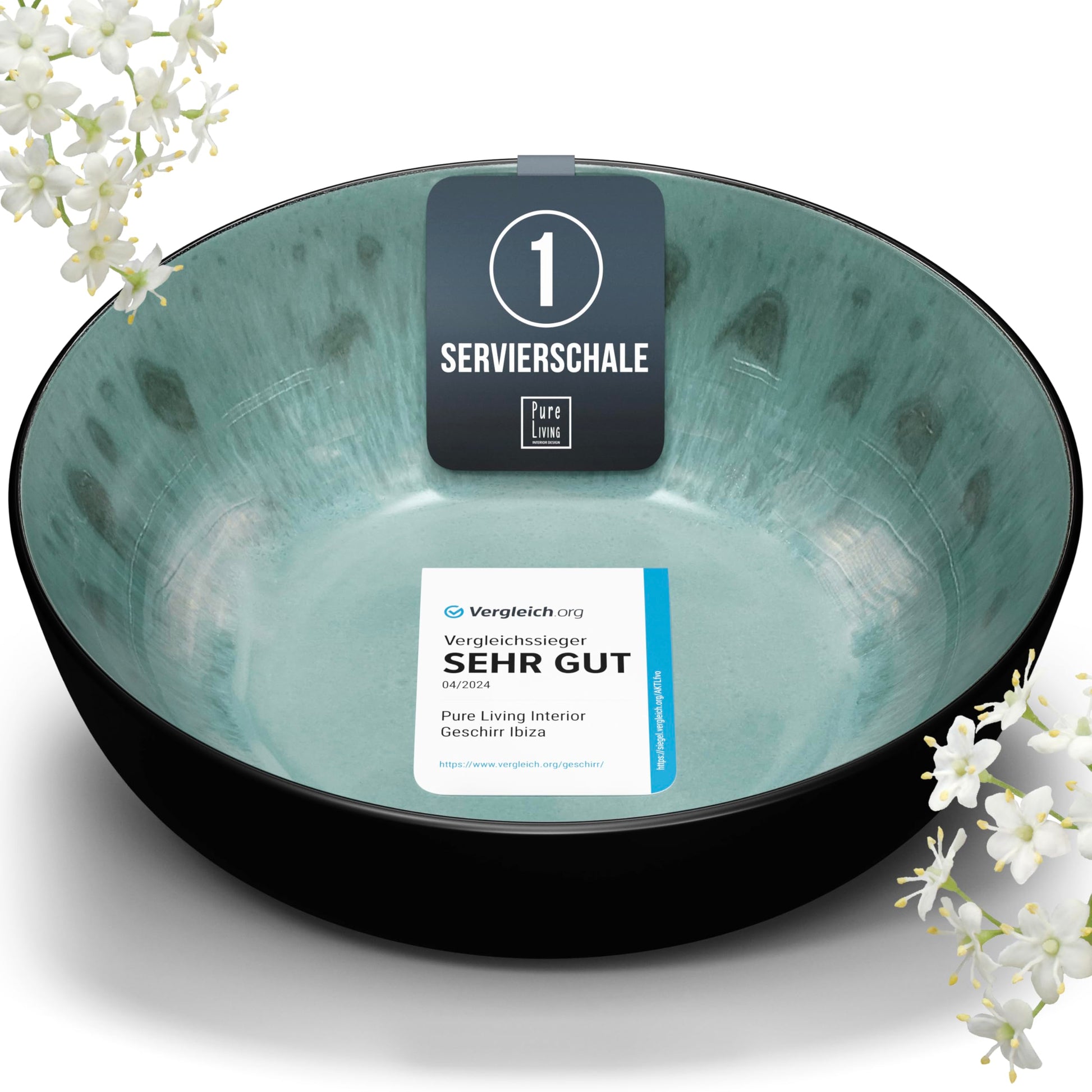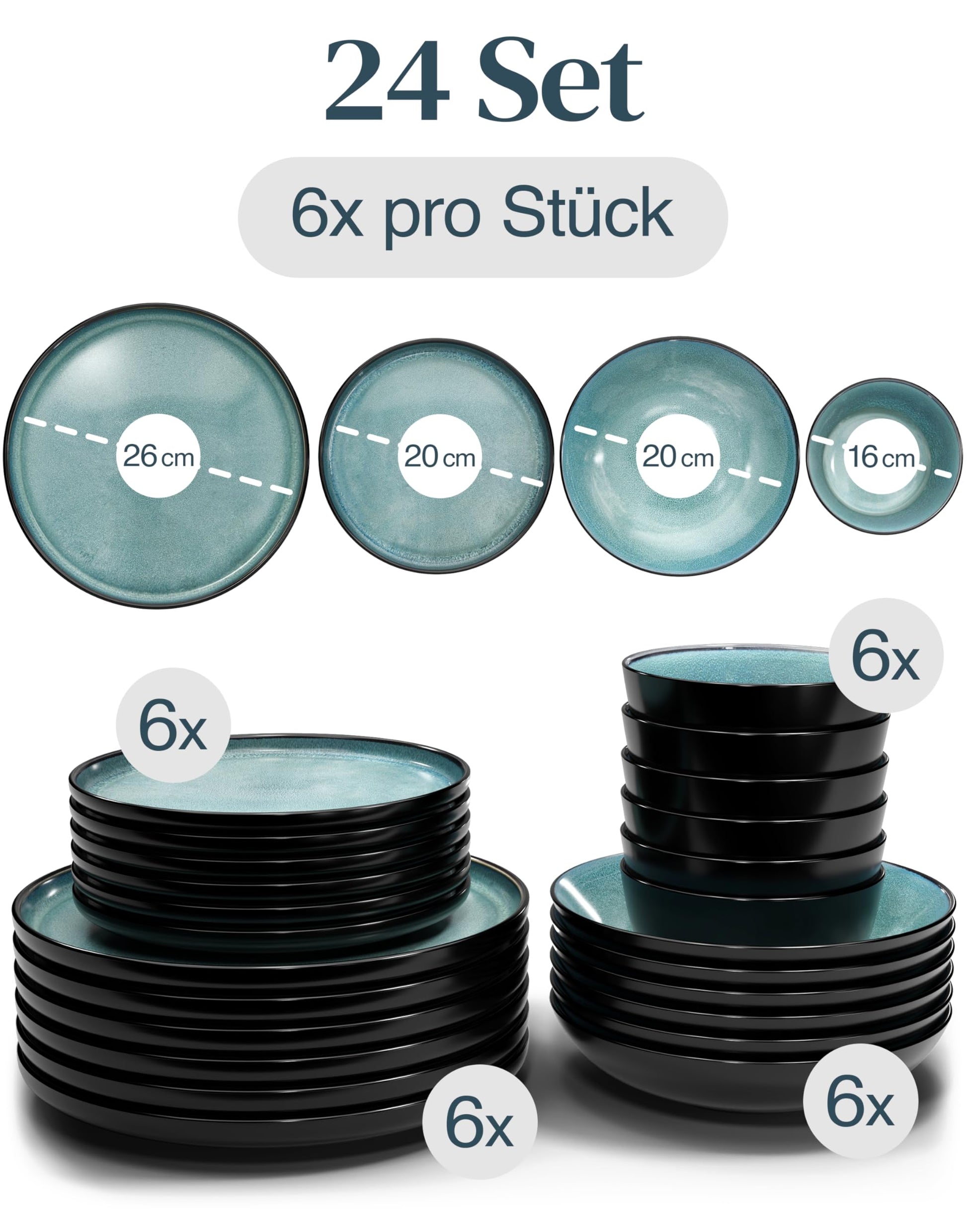 This 24-piece Ibiza Stoneware Crockery Set serves 6 people and combines petrol and matte black tones for a stylish, island-inspired look. Made from durable stoneware with a glazed, scratch-resistant surface, it includes dinner plates, breakfast plates, deep plates, and bowls. The set is microwave- and dishwasher-safe, designed for everyday use and special occasions alike.